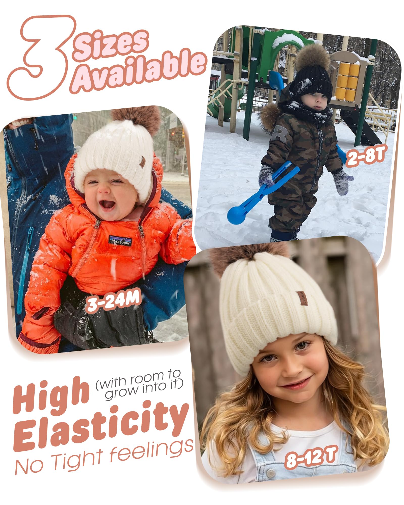 Beautifully and softly knitted. Knit part is 100% soft acrylic. Great fit for both little boys and little girls alike. Two Size,the fit ranges from baby and toddler to kids and children. The beanie for children with elastic,has plenty of stretch , head circumference 15.7"- 21.2" (40cm - 54cm),diameter is about 15cm and 16cm.