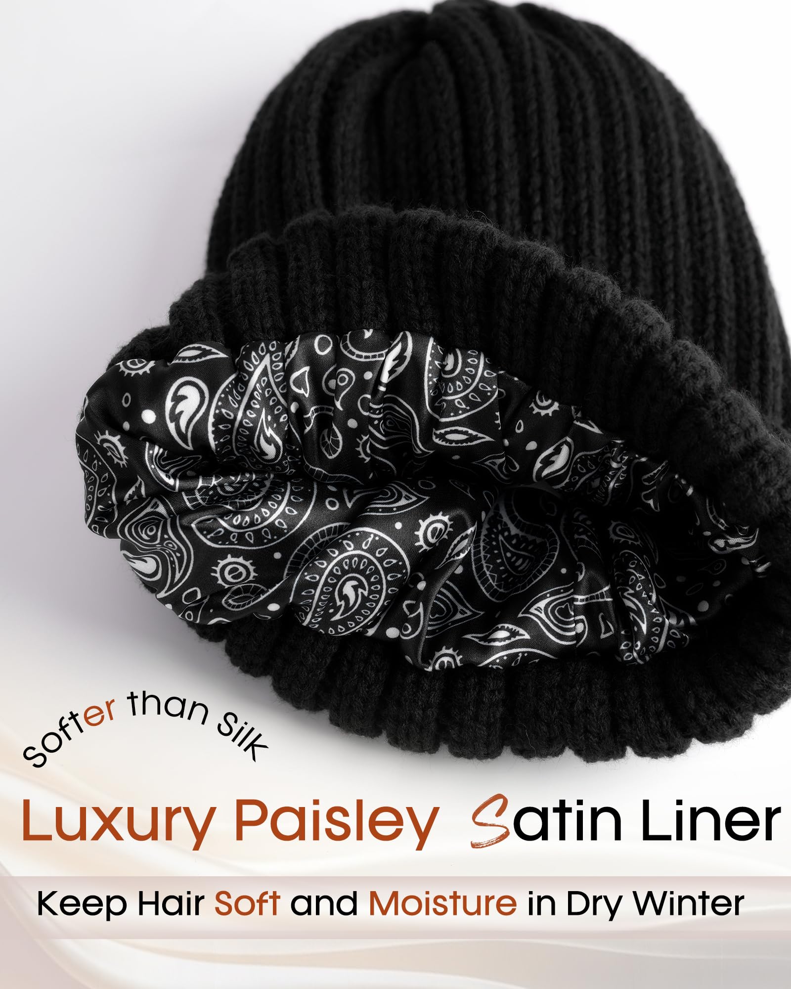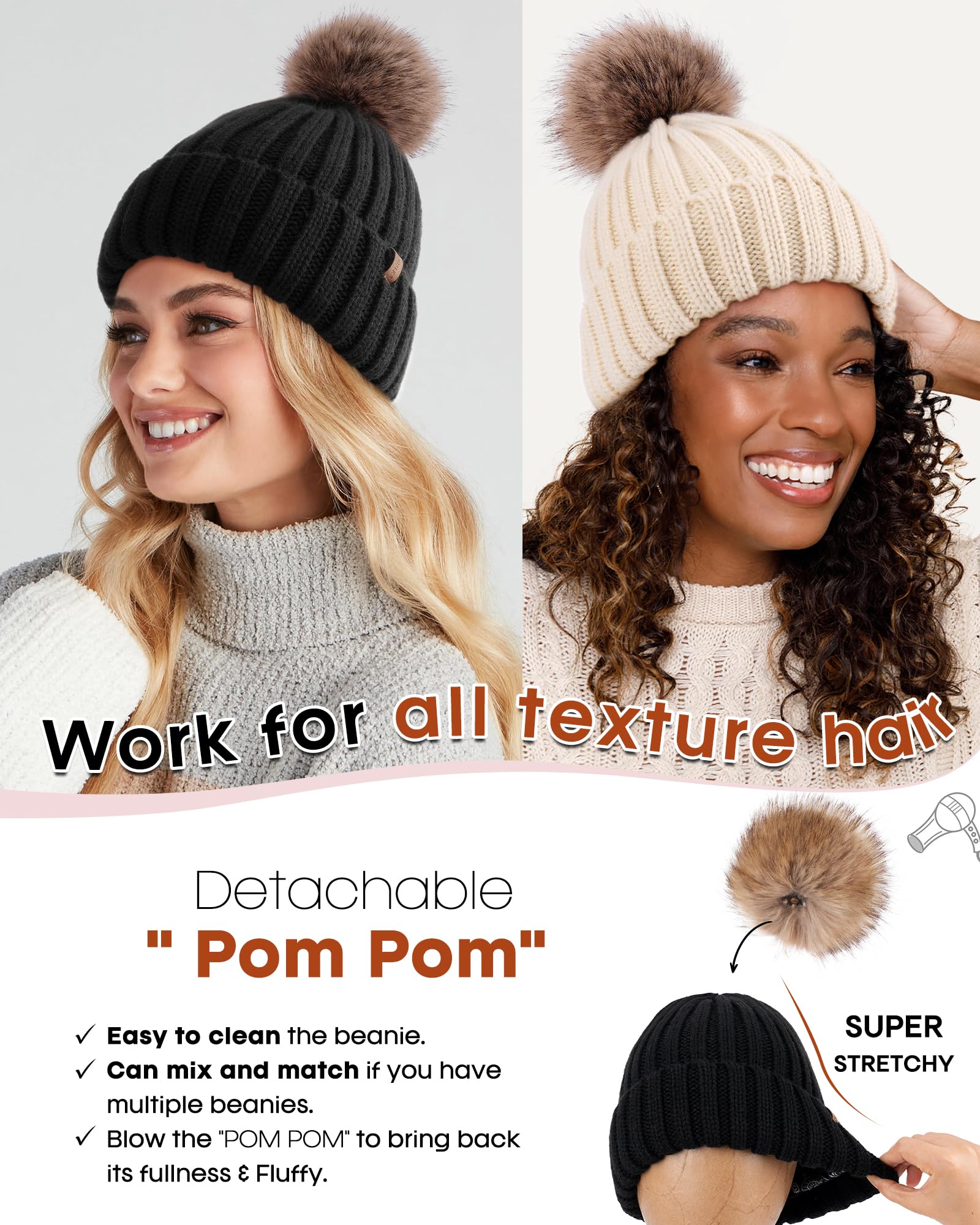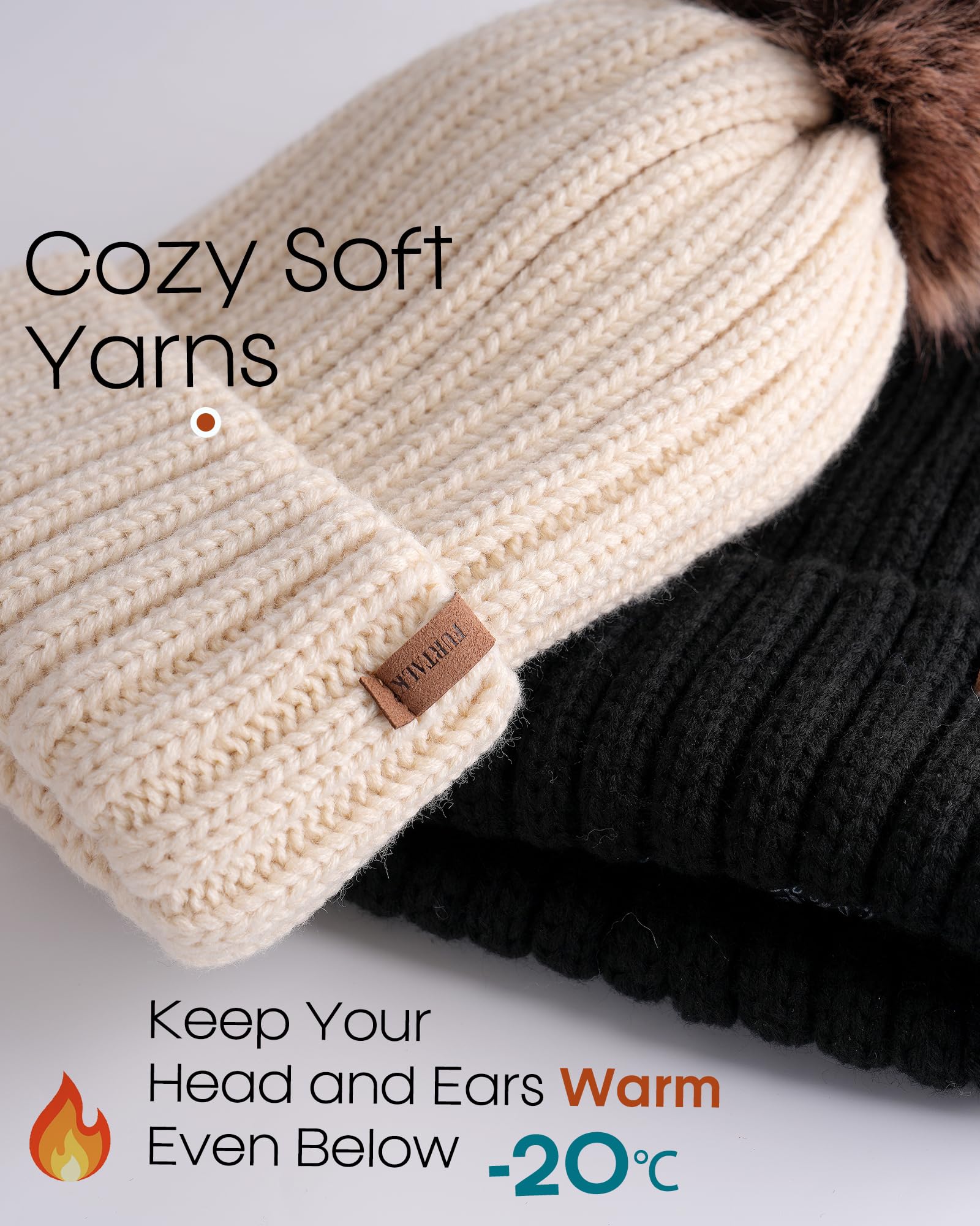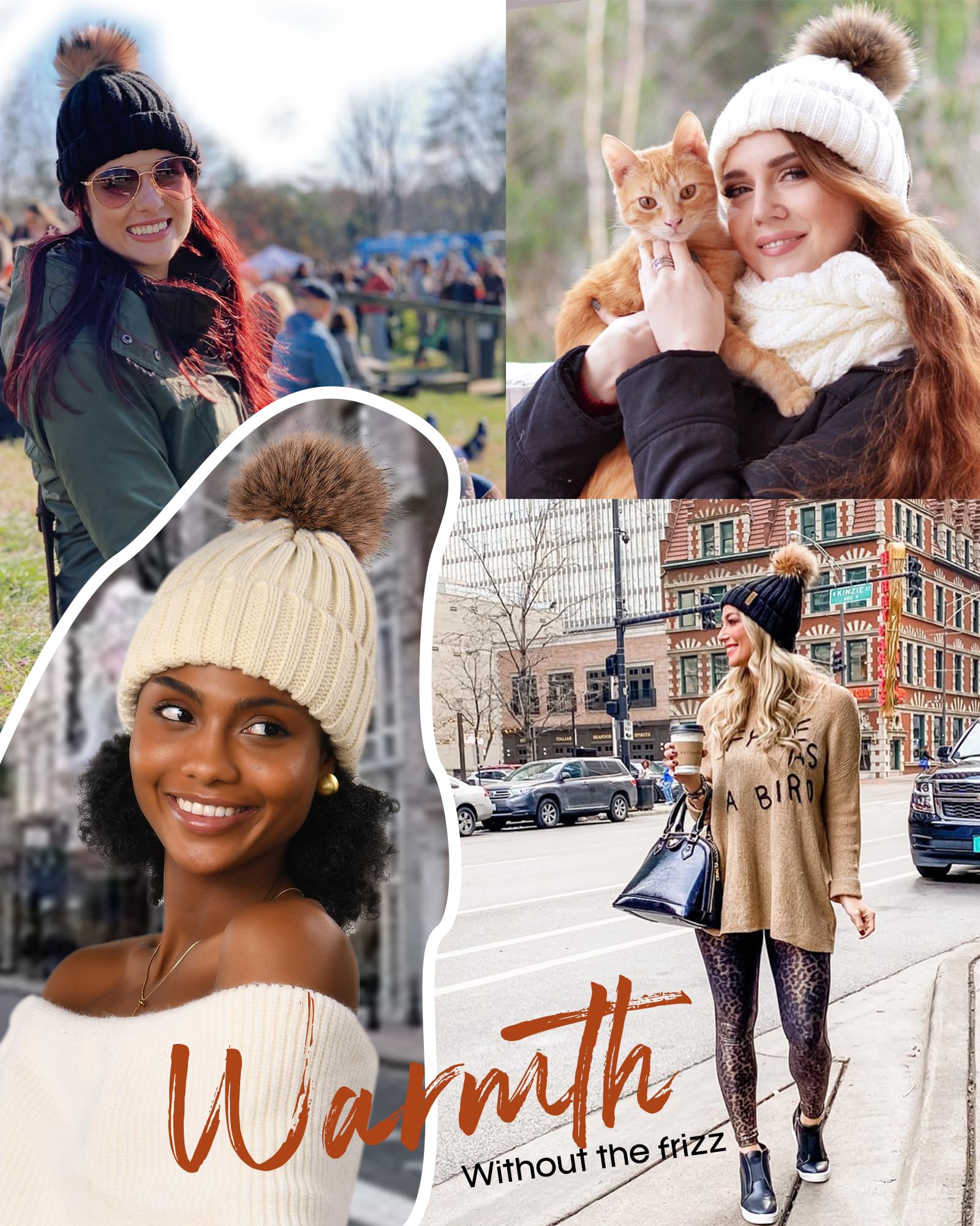 FURTALK Womens Winter Beanie Hat Satin Lined Faux Fur Pom Pom Beanies Hat for Women Winter Warm Knit Hats