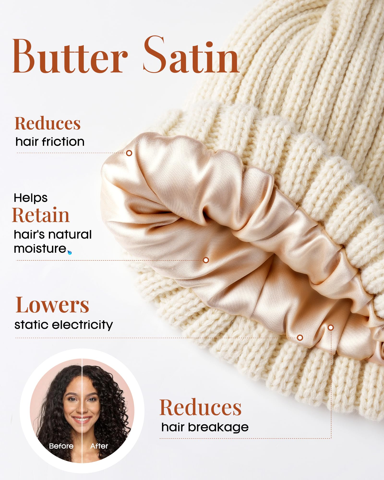 FURTALK Womens Winter Beanie Hat Satin Lined Faux Fur Pom Pom Beanies Hat for Women Winter Warm Knit Hats