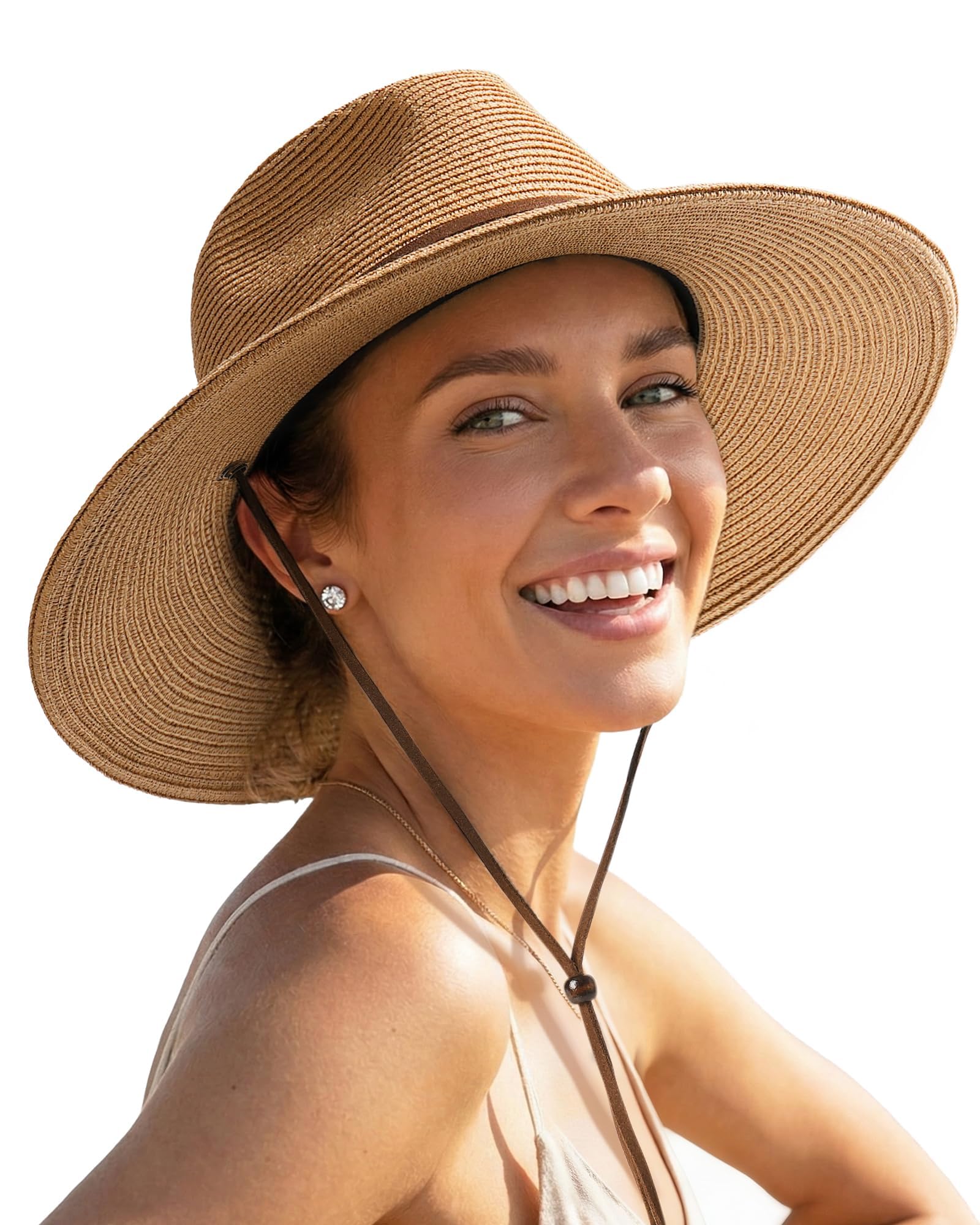 FURTALK Womens Summer Straw Sun Hats Wide Brim Panama Fedora Beach Hat with Wind Lanyard UPF 80+