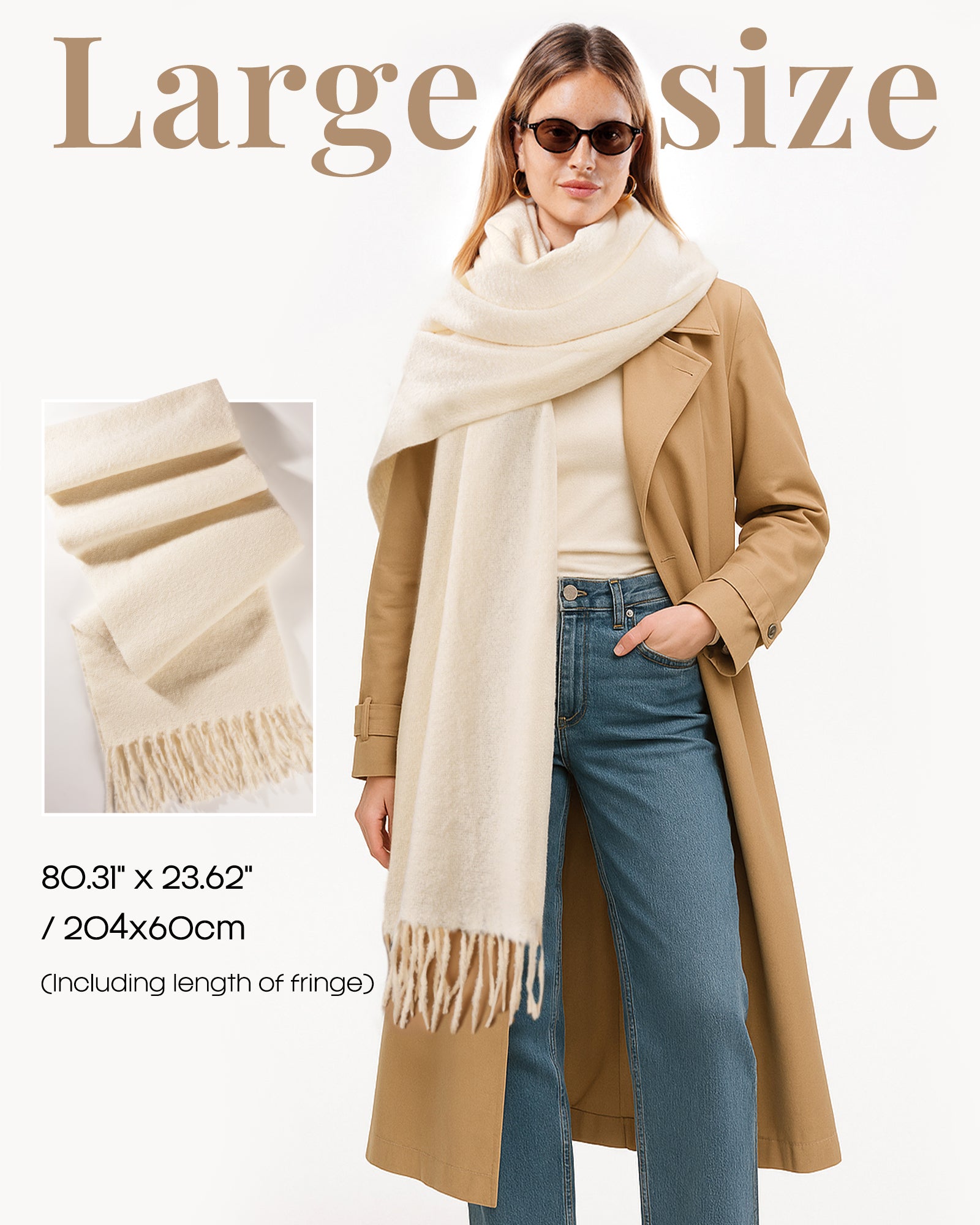Extra-Large & Versatile – Measuring 204x60cm (80.31x23.62 inches), this oversized scarf can be styled in multiple ways: as a shawl, wrap, cape, or blanket scarf. The elegant tassel detailing adds a chic touch for any occasion