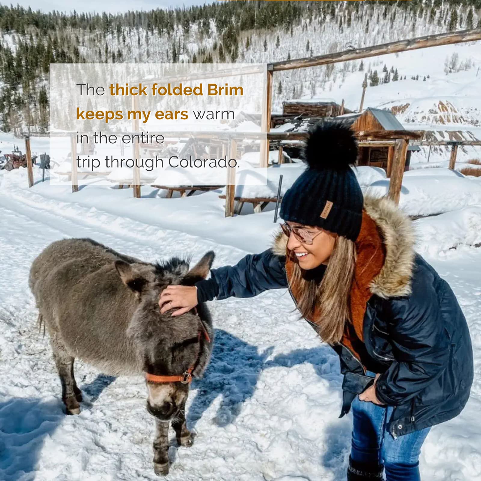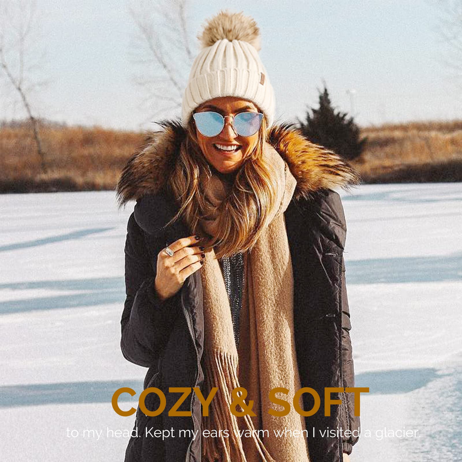 The winter knit hat is made of 100% soft acrylic, warm, thick and soft beanie hat for your cold winter. Beanie for women with elastic, one size with good stretch, head circumference: Approx 21.26"-23.62"(54-60cm) that will fit most people head size.